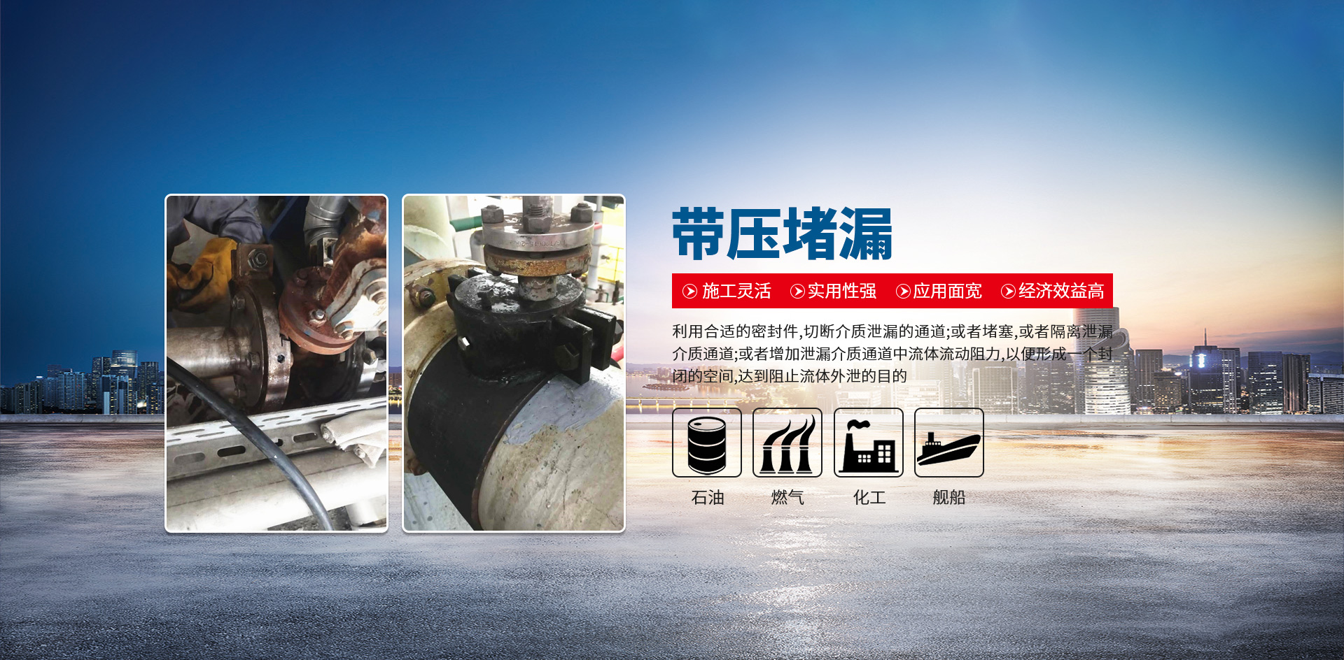 公司擁有堵漏工程技術專家,施工管理人員及施工技術工藝和專業的施工隊伍,成功解決了石油、化工、冶金、熱電、化纖、供熱、供氣等企業突發性泄漏問題,挽回了企業因泄漏而造成的巨大損失。工程施工已涉足民用建筑、水利水電、市政、橋梁、隧道、煤炭礦山、電力化工、軍工航天、核工業等行業,工程業績遍布全國各地。在承接高難度工程和 重點工程中都以工程質量保證、安全率高、信譽好贏得廣大客戶的一致好評。